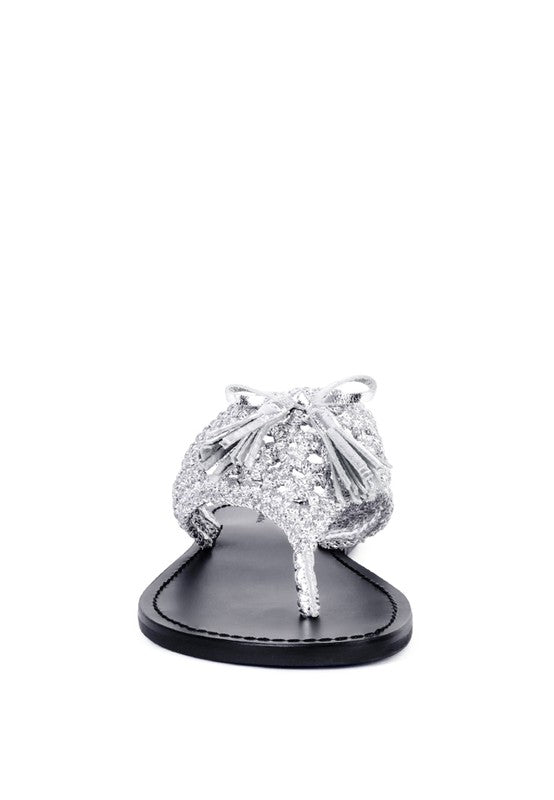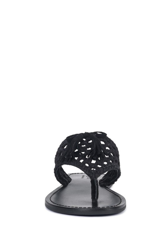 The Classic summer Thong flats with 100% Natural cotton woven structure with soft suede frame detail and the tassels at the top. The round toe open slides are casual, comfort shoes from Rag & Co.